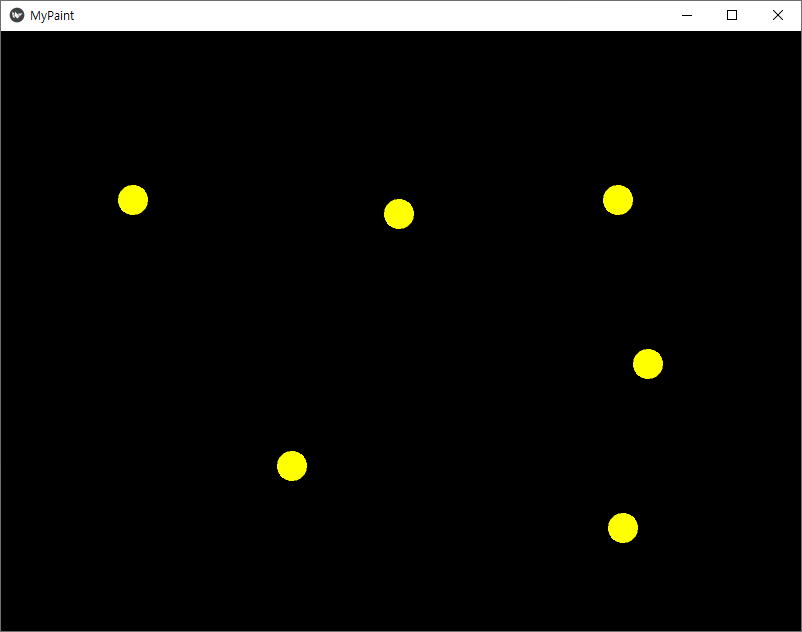 검은 색 그림판이 생성되고 마우스로 클릭하면 노란 점이 하나씩 생긴다.