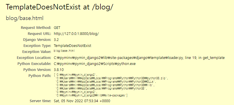 아래처럼 TemplateDoesNotExist가 뜨면 정상이다. 우린 아직 html 파일을 만든적이 없다.