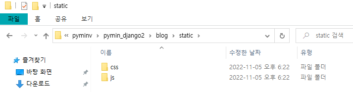 이제 C:\pyminv\pymin_django2\blog\static에 디렉토리를 만들고 위에서 확인한 css와 js 폴더를 그대로 복사해둔다.