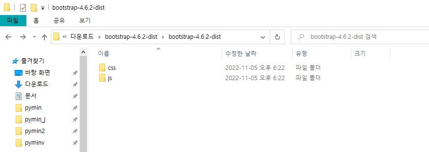 인터넷이 가능한 환경이라면 css js를 넣지 않고 html에 bootstrap web주소를 등록해서도 사용할 수 있지만 참고로 필자는 인터넷을 사용할 수 없는 폐쇠망에서의 실행을 기본 원칙으로 진행하고 있다.