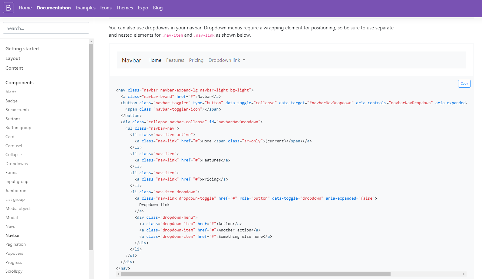 bootstrap의 Components 왼쪽 아래에서 Navbar를 클릭한 후 쭉 내리다보면 나름 괜찮아 보이는 Navbar가 있다. 그리고 아래를 보면 html 코드가 있다. 이쯤되면 감이 온다. 해당 code를 복사해서 이전에 만든 base.html에 붙인다.