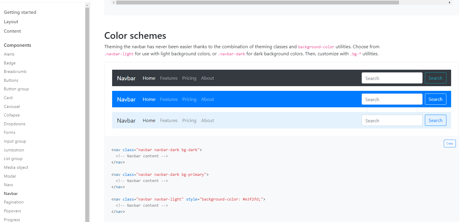 어떻게 하면 바꿀수 있을지 고민하면서 Navbar 항목을 내리다보니 color schemes 가 있다 아래에 있는대로 변경해주자