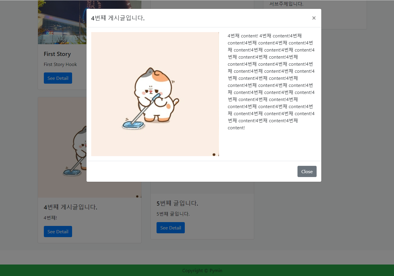 이렇게하면 modal이 잘 매핑이 되어서 See Detail을 누르면 상세 내용이 나타나게 된다. 4번째 글의 See Detail을 눌러보니 팝업창으로 상세 내용이 잘 출력되는것을 볼 수 있다.