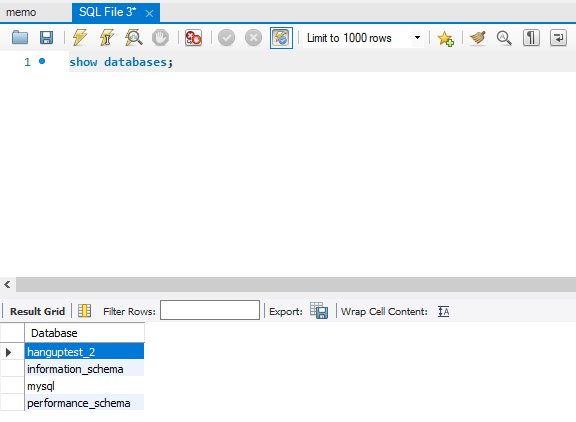 해당 스크립트를 수행하고 mysql의 Database를 검색하면 아래와 같이 hanguptest_2 라는 신규 Database가 생성된 것 을 확인할 수 있다.