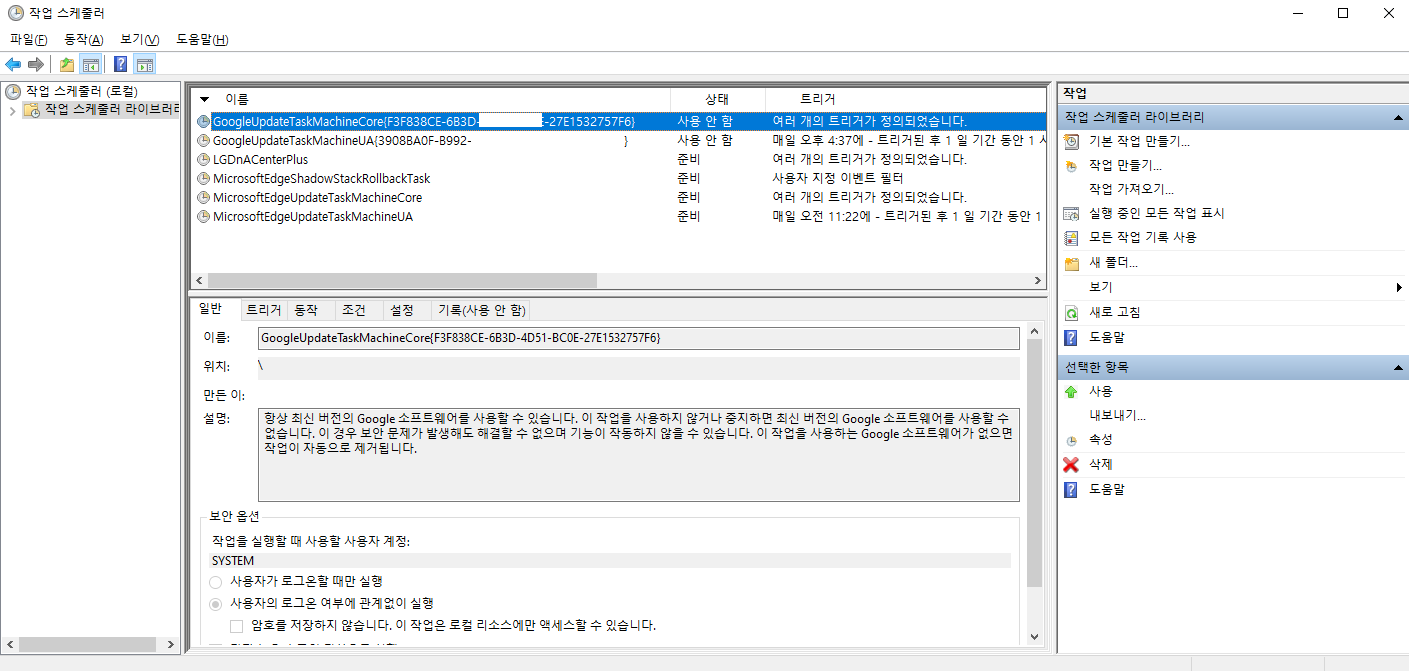 작업 스케줄러 화면이 나타나며 아래 두개의 이름이 있다.