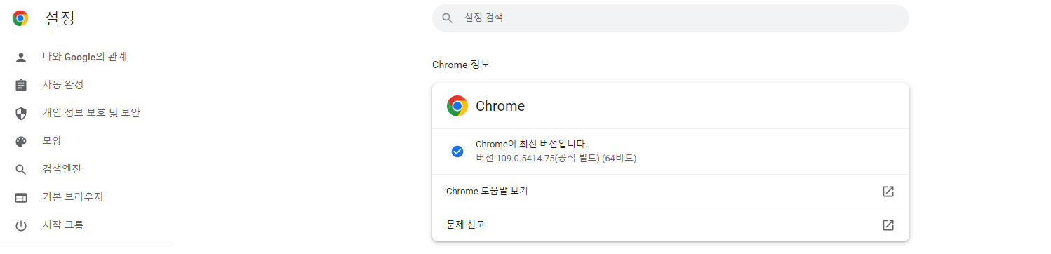 버전 확인 방법은 크롬 > 설정 > Chrome 정보에 가면 알 수 있다.